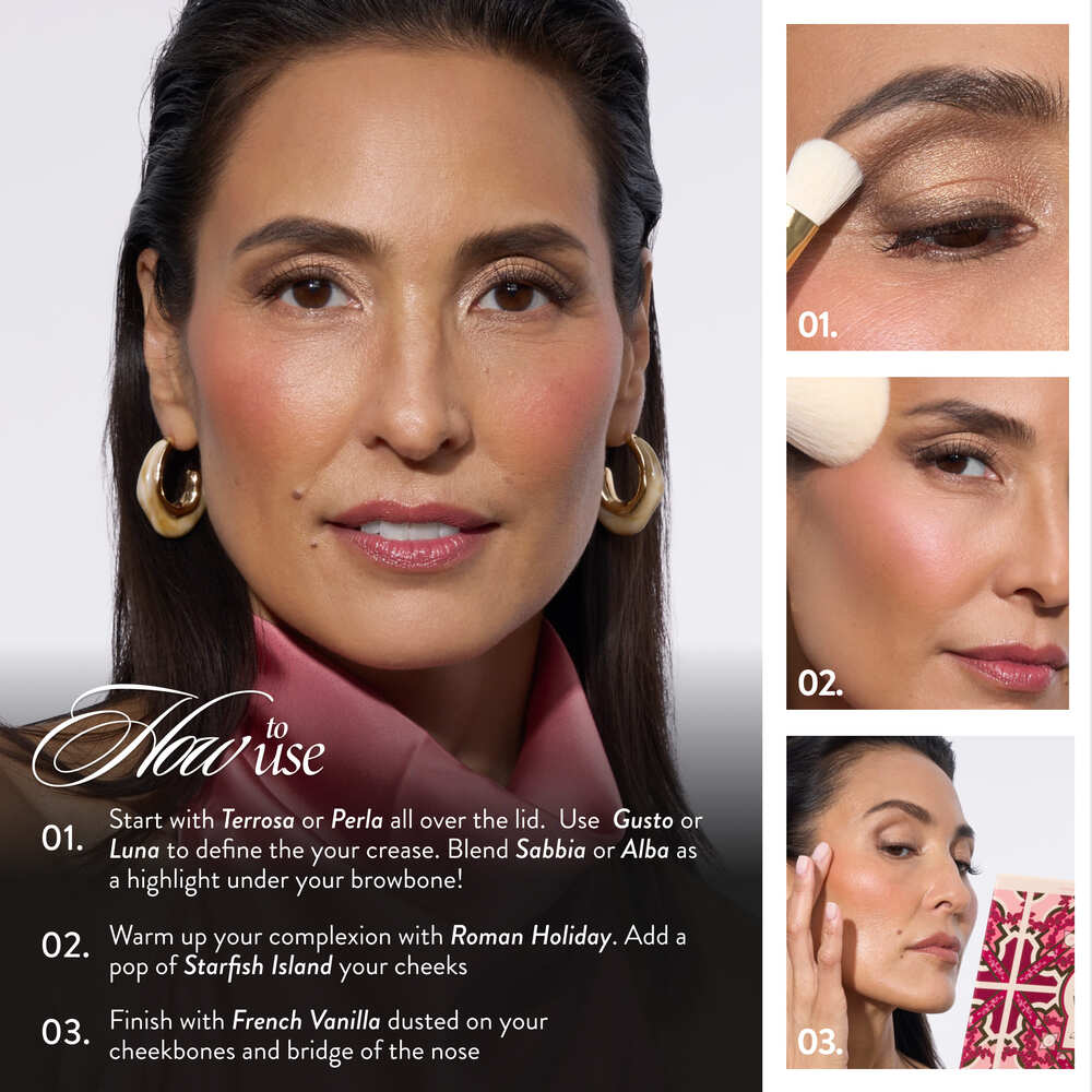 It’s time for your bake-over! This palette features a stunning assortment of our bestselling Italian-made baked products, all inspired by a Tuscan getaway. It includes six luxurious baked eyeshadows, Baked Bronze-n-Brighten in Roman Holiday, Baked Original Highlighter in French Vanilla and Baked Blush-n-Brighten in Starfish Island. Each versatile shade is highly pigmented to sculpt, define and enhance for flawless, all-day wear.
